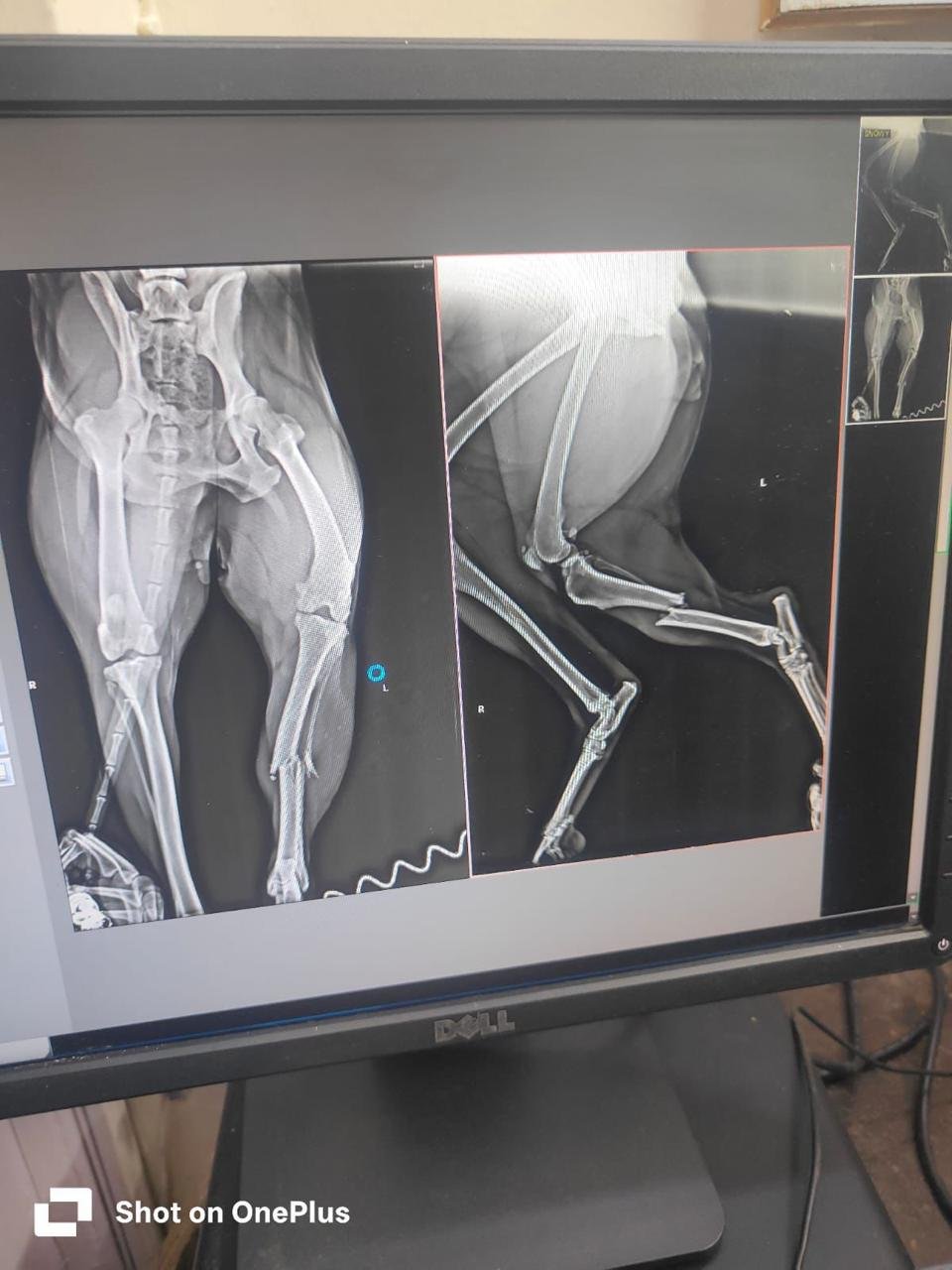 Her first surgery was done with care, and Snowy came to us at Paws & Pause for her post-operative healing. Those early days were all about rest, comfort, and gentle love. We didn’t let her play too much; instead, we encouraged her to relax, recover, and just be herself. Slowly, she cozied up to the environment. She made new friends, enjoyed her biscuits, ate healthy meals with eggs, and took all her prescribed medicines like a brave girl. But as the days went by, we noticed that Snowy continued to limp. Even though she was healing and growing stronger, something felt off. We monitored her closely, hoping it was just temporary soreness. However, once the one-month mark approached and it was time for her review, we took her for an X-ray at Max Vets in Raj Nagar. That is when we finally understood the reason behind her persistent limp—the rod had migrated. It was an unexpected and worrying discovery. We were given two options: remove the rod completely, which was risky so early in her recovery, or trim the rod. We immediately connected with her rescuers and discussed the best path forward.